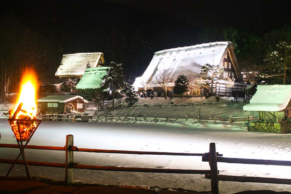 雪化粧した合掌造り家屋が純白の光に照らされ、幻想的な冬の風景が広がります。 ライトアップの時間帯も4つの民家を開放し内部をご見学していただけます。甘酒としいたけ茶の振る舞いを行います。