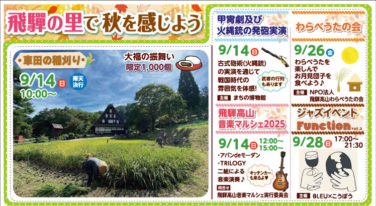また、アコースティックライブやジャズ演奏が響く音楽イベント、親子で楽しむわらべうたや折り紙づくりなど、芸術の秋を感じる飛驒の里にぜひお越しください。